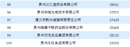 2019年贵州省民营企业100强榜单显示,100强企业营业收入总计1571.81亿元,其中,贵州通源集团以年度234.04亿元的营业收入总额位列第一位,贵州宏立城集团、贵州信邦制药股份有限公司分别位居第二位和第三位。榜单的前十企业总营业收入为677.96亿元,占总营业收入4成;分别为贵州通源集团、贵州宏立城集团、贵州信邦制药股份有限公司、贵州财富之舟科技有限公司、贵州麒龙房地产开发集团有限公司、贵阳南明老干妈风味食品有限责任公司、贵州中伟投资集团有限公司、贵阳星力百货集团有限公司、贵州益佰制药股份有限公司、贵州康心药业有限公司。以下是榜单详情: