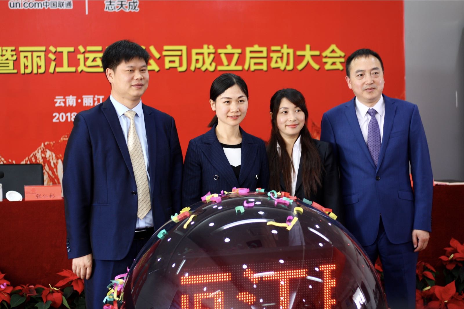 丽江市人民政府分管领导张仁彬,云南联通副总经理温涛,贵州志天成董事长陈勇,丽江市工信委主任郑克坚,云南联通丽江分公司总经理杨美志共同点亮了启动球。