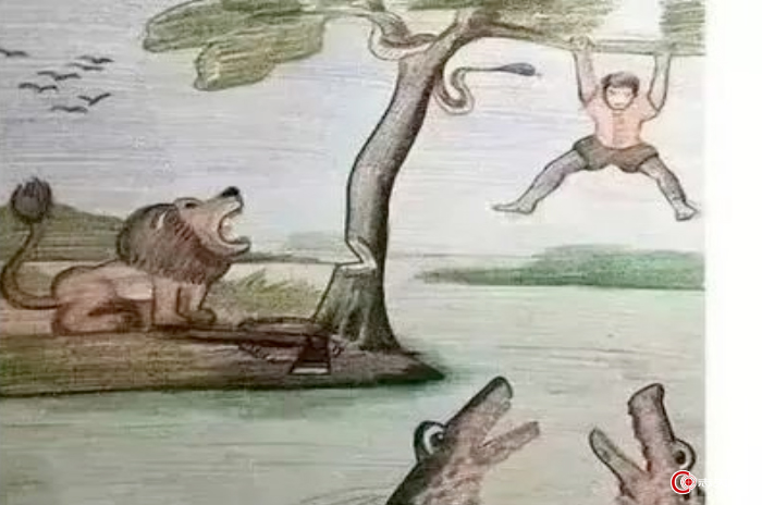 大树:是你的企业。企业时刻都有被折断的危险。水:水是你的财产,财产越多,危险越重。君不见多少大鳄昨日风光无限、今日已成牢狱之身。水中的鳄鱼:是你的同行。无事时,友好和你;有危难时,他张大嘴等待吃掉你。树上的蛇:是缠在你所欠上的债务。不解决你的债务,债务就时刻盯着你,时刻威胁着你的生命。现在很多企业不是都死在债务问题上了吗?天上的大雁:是你的亲友团。你好,亲友共绕;你难,亲友都飞。树上吊着的人:就是企业的法人。谁都可以离树而逃,唯他必须独自承担,无依无靠。地下的斧子:就是你企业的产品,产品必须时刻具备唯一性和必须性。别指望会有谁来救援,解决方案只有一个:“心不乱,咬牙尖,坚持住,清债务。”