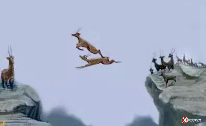 突然,奇迹出现了,老公班羚凭着娴熟的跳跃技术,在半大班羚从最高点往下降落的瞬间,身体出现在半大班羚的蹄下。老公班羚的时机把握得很准,当它的身体出现在半大班羚蹄下时,刚好处在跳跃弧线的最高点。就像两艘宇宙飞船在空中完成对接一样,半大班羚的四只蹄子在老公班羚的背上猛蹬了一下,如同借助一块跳板一样,它在空中再度起跳,下坠的身体奇迹般地又一次升高。而老公班羚就像燃料已输送完了的火箭残壳,自动脱离宇宙飞船。它甚至比火箭残壳更悲惨,在半大班羚的猛力踢蹬下,像只被突然折断了翅膀的鸟笔直坠落下去。可是,那半大班羚的第二次跳跃力度虽然远不如第一次,高度也只有从地面跳跃的一半,但足够跨越剩下的最后两米距离了。瞬间,只见半大班羚轻巧地落在对面山峰上,兴奋地「咩」叫一声,转到磐石後面不见了。试跳成功!紧接着,一对一对班羚凌空跃起,山涧上空划出一道道令人眼花撩乱的弧线,一只只老年班羚全摔得粉身碎骨。