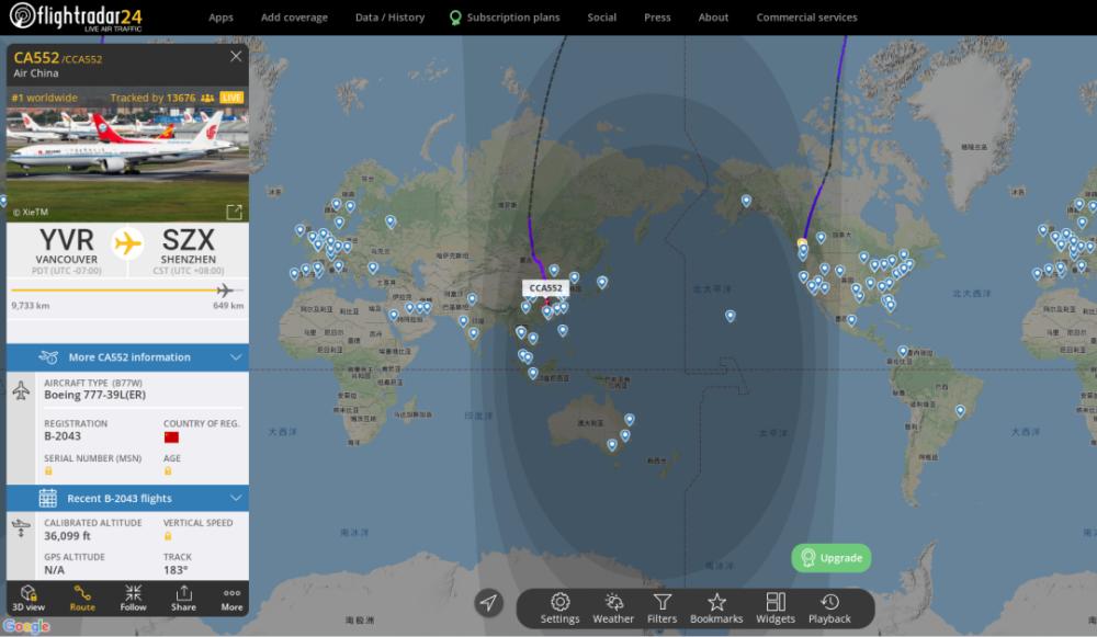 孟晚舟所搭乘航班飞行路径图 图自“Flightradar24”